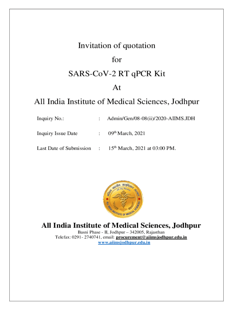 Invitation of quotation for SARSCoV2 RT PCR Kit At All India Institute of Medical Sciences, Jodhpur Inquiry No.::Admin/Gen/0808(ii)/2020AIIMS. Inquiry Issue Date:09th March, 2021Last Date of Submission:15th