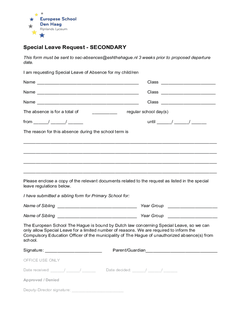 Special Leave Request SECONDARY This form must be sent to secabsences@eshthehague.nl 3 weeks prior to proposed departure date. I am requesting Special Leave of Absence for my child/men Name ___Class