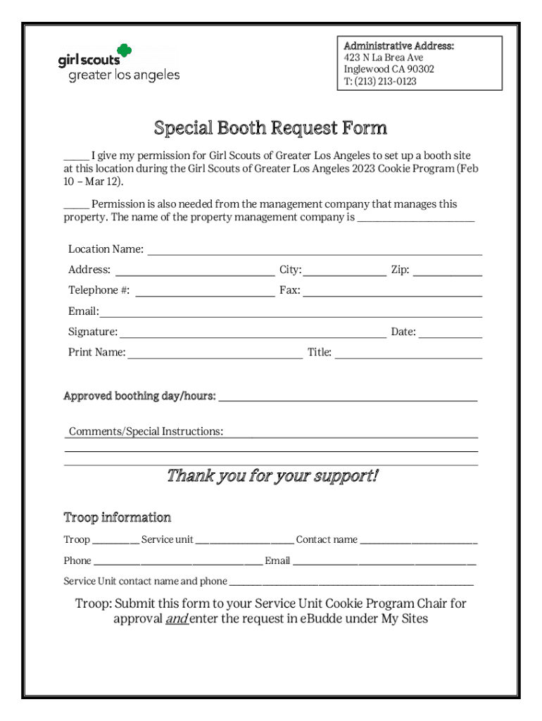 Administrative Address: 423 N La Area Ave Inglewood CA 90302 T: (213) 2130123Special Booth Request Form ___ I give my permission for Girl Scouts of Greater Los Angeles to set up a booth site at this