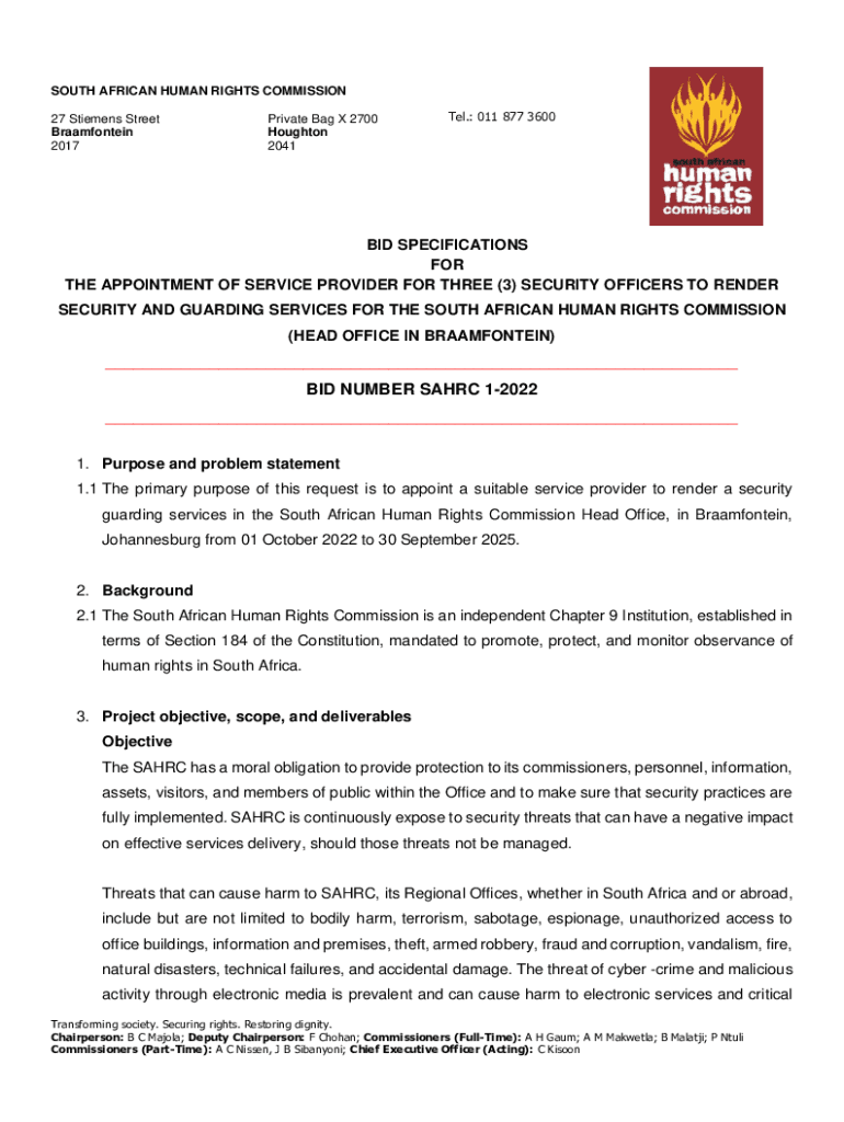SOUTH AFRICAN HUMAN RIGHTS COMMISSION 27 Siemens Street Bloemfontein 2017Private Bag X 2700 Houghton 2041Tel.: 011 877 3600BID SPECIFICATIONS FOR THE APPOINTMENT OF SERVICE PROVIDER FOR THREE (3)