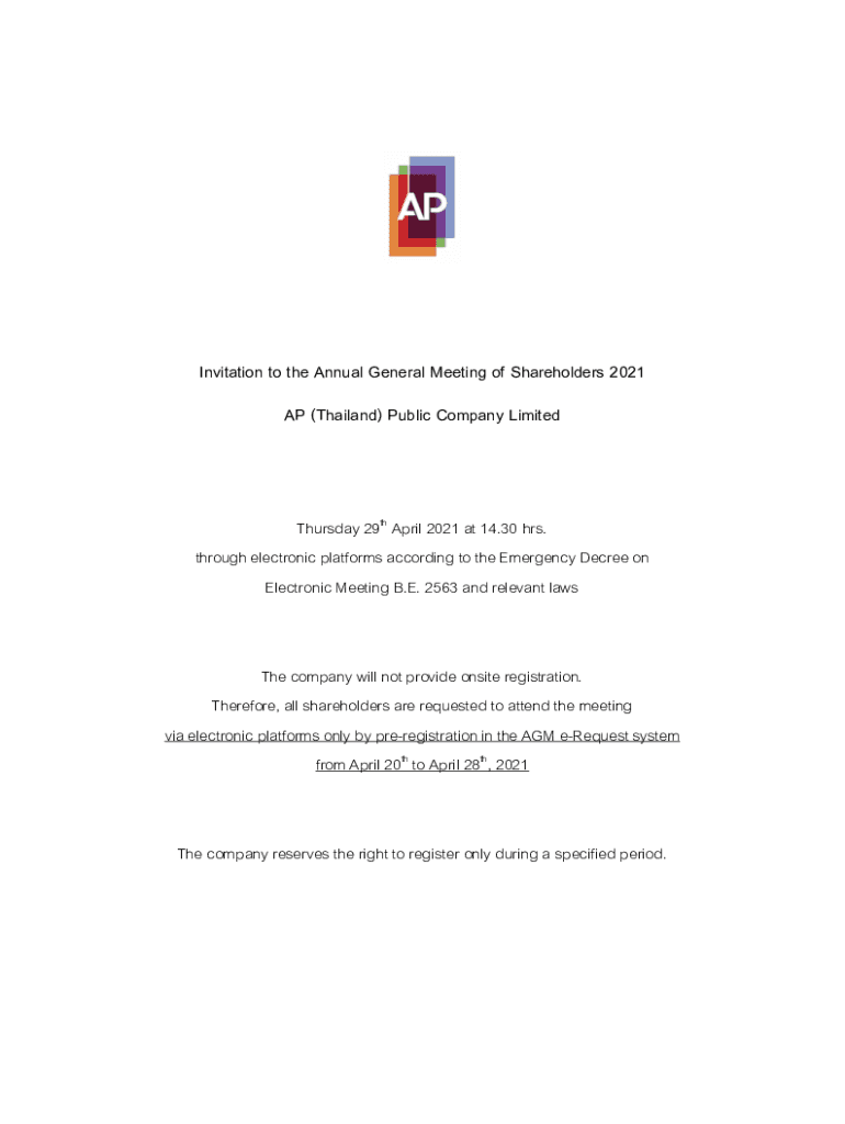 0Invitation to the Annual General Meeting of Shareholders 2021 AP (Thailand) Public Company Limited Thursday 29th April 2021 at 14.30 hrs. Through electronic platforms according to the Emergency Decree