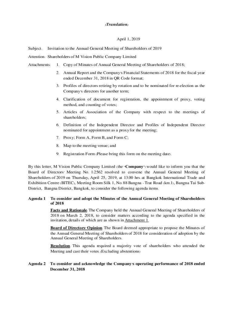 (Translation)April 1, 2019, Subject:Invitation to the Annual General Meeting of Shareholders of 2019Attention: Shareholders of M Vision Public Company Limited Attachments:1. Copy of Minutes of Annual