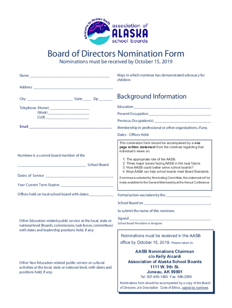 Board of Directors Nomination Form Nominations must be received by October 15, 2019Name ___Ways in which nominee has demonstrated advocacy for children:Address ___ City ___ State ___ Zip ___Background