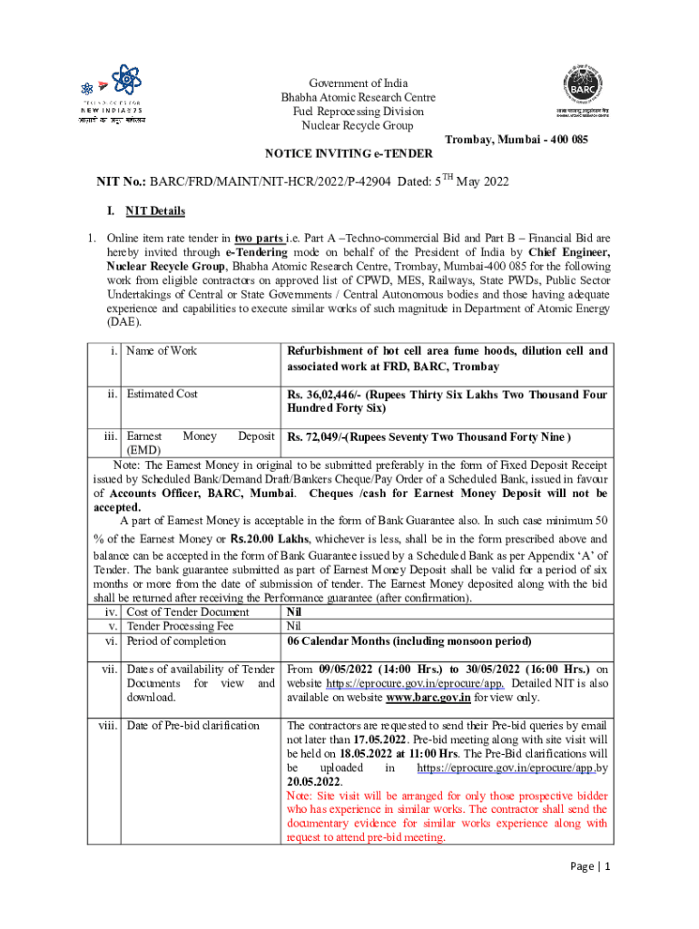 Government of India Baha Atomic Research Center Fuel Reprocessing Division Nuclear Recycle Group NOTICE INVITING eTENDERTrombay, Mumbai 400 085NIT No.: BAR/FRD/MAIN/EITHER/2022/P42904 Dated: 5 TH