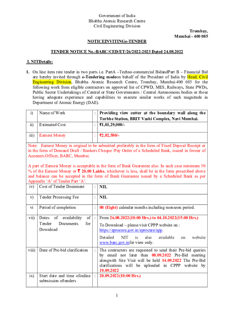 TENDER NOTICE No.:BAR/CED/ET/26/20222023 Dated 24.08.2022