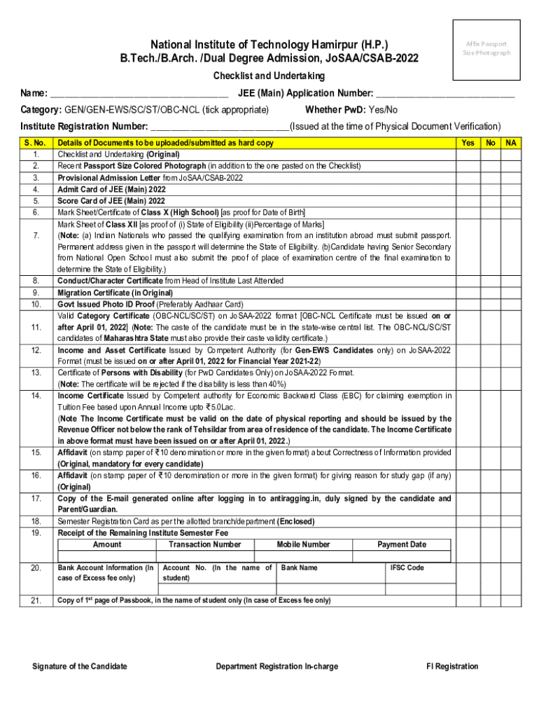 National Institute of Technology Khairpur (H.P.) B. Tech./B.Arch. /Dual Degree Admission, Jo SAA/CSAB2022Affix Passport Size PhotographChecklist and Undertaking Name: ___ SEE (Main) Application Number: