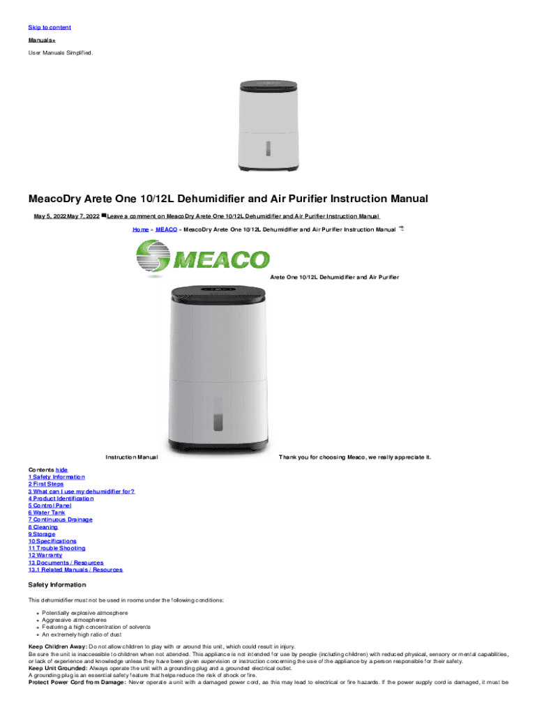 User Manuals Simplified. Memory Crete One 10/12L Dehumidifier and Air Purifier Instruction Manual