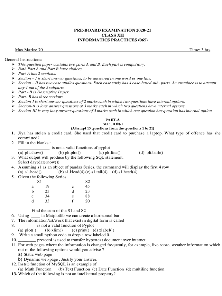 PREBOARD EXAMINATION 202021 CLASS XII INFORMATICS PRACTICES (065) Max Marks: 70Time: 3 general Instructions: This question paper contains two parts A and B. Each part is compulsory. Both Part A and
