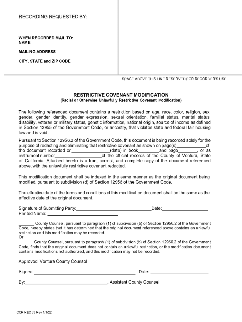 Get the free Recording of Restrictive Covenant Modification AB 1466 ... - recorder countyofventura