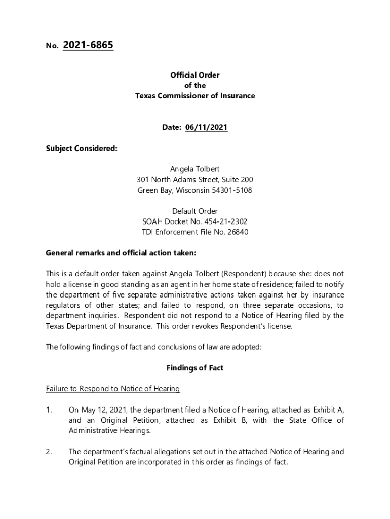 No.20216865 Official Order of the Texas Commissioner of Insurance Date: 06/11/2021Subject Considered: Angela Colbert 301 North Adams Street, Suite 200 Green Bay, Wisconsin 543015108 Default Order