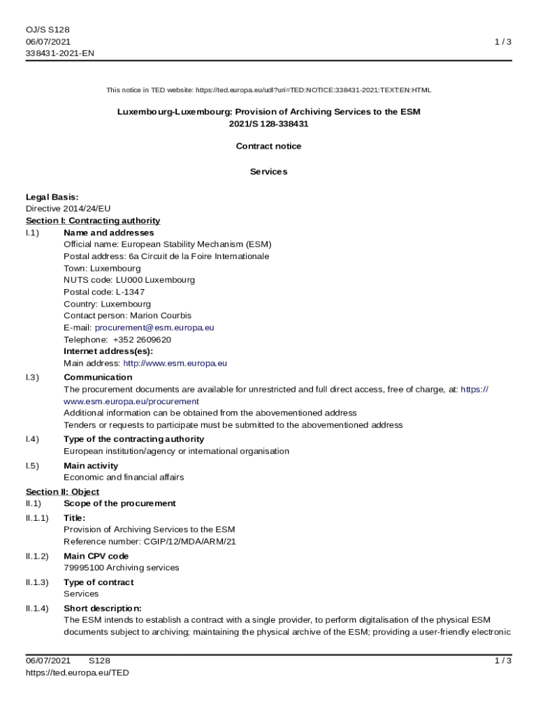 OJ/S S128 06/07/2021 3384312021EN1/3This notice in TED website: https://ted.europa.eu/udl?uriTED:NOTICE:3384312021:TEXT:EN:HTMLLuxembourgLuxembourg: Provision of Archiving Services to the ESM 2021/S