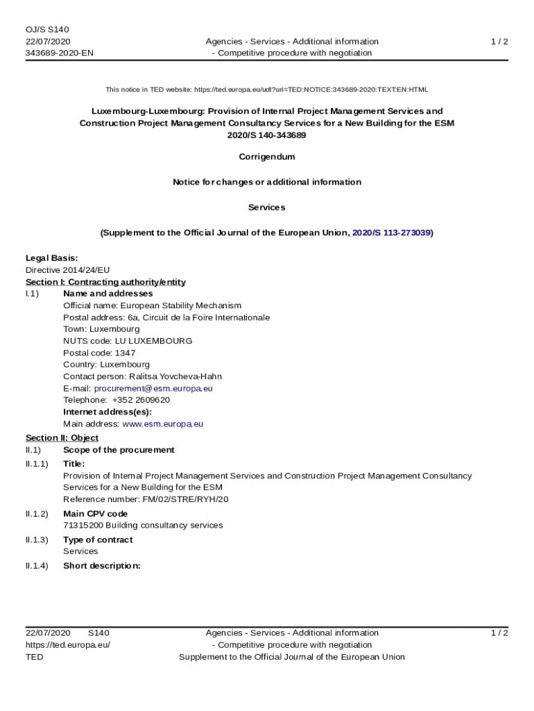 OJ/S S140 22/07/2020 3436892020ENAgencies Services Additional information Competitive procedure with negotiation1/2This notice in TED website: https://ted.europa.eu/udl?uriTED:NOTICE:3436892020:TEXT:EN:HTMLLuxembourgLuxembourg:
