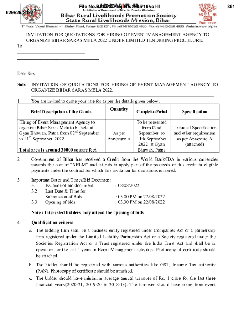 File No.BRLPS/ProjNF/1605/19VolII391I/29926/2022INVITATION FOR QUOTATIONS FOR HIRING OF EVENT MANAGEMENT AGENCY TO ORGANIZE BIHAR SARAH MELT 2022 UNDER LIMITED TENDERING PROCEDURE. To ___ ___ ___
