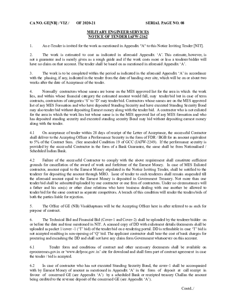CA NO. GE[NB] / VIZ /OF 202021SERIAL PAGE NO. 08MILITARY ENGINEER SERVICES NOTICE OF TENDER IAFW2162 1. A tender is invited for the work as mentioned in Appendix \” A\” to this Notice Inviting