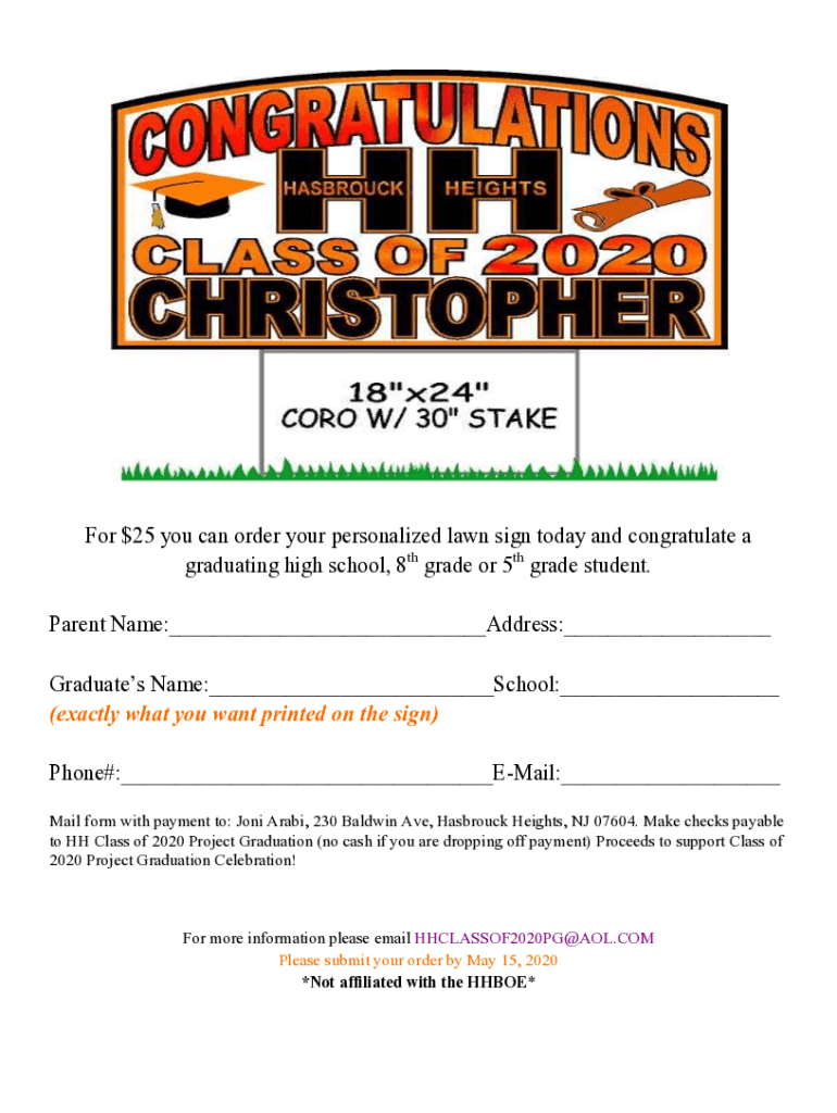 For $25 you can order your personalized lawn sign today and congratulate a graduating from high school, 8th grade or 5th grade student. Parent Name:___Address:___ Graduates Name:___School:___ (exactly