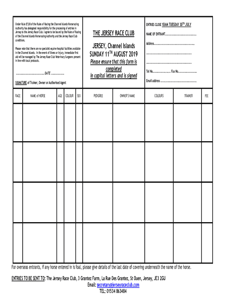 Under Rule (F)38 of the Rules of Racing the Channel Islands Horse racing Authority has delegated responsibility for the processing of entries in Jersey to the Jersey Race Club. I agree to be bound