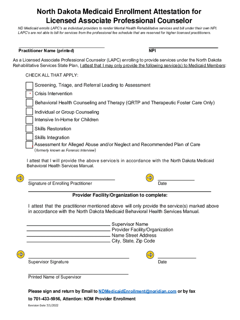 North Dakota Medicaid Enrollment Attestation for Licensed Associate Professional Counselor ND Medicaid enrolls LAP\'s as individual providers to render Mental Health Rehabilitative services and bill