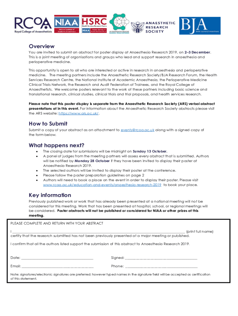 Overview You are invited to submit an abstract for poster display at Anesthesia Research 2019, on 23 December. This is a joint meeting of organizations and groups who lead and support research in