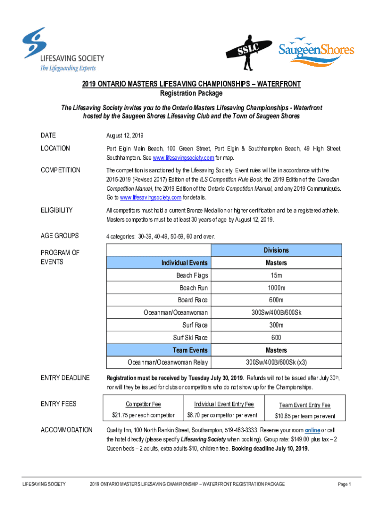 2019 ONTARIO MASTERS LIFESAVING CHAMPIONSHIPS WATERFRONT Registration Package The Lifesaving Society invites you to the Ontario Masters Lifesaving Championships Waterfront hosted by the Maureen Shores