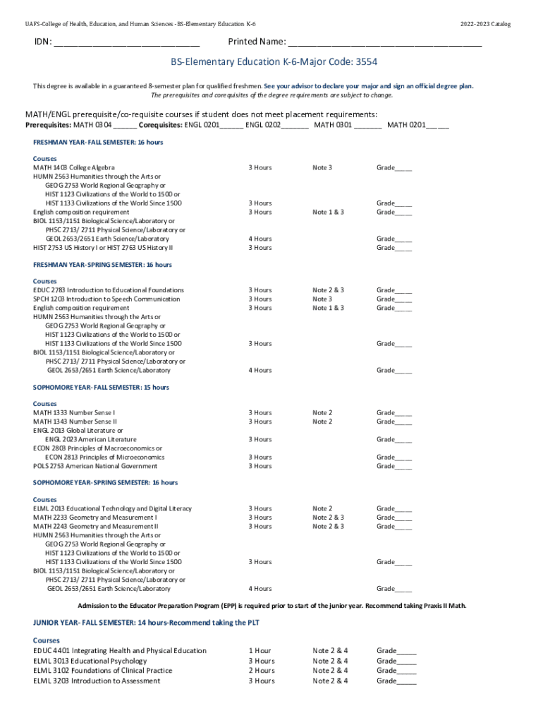 UAFSCollege of Health, Education, and Human Sciences Elementary Education K6IDN: ___20222023 CatalogPrinted Name: ___Elementary Education K6Major Code: 3554 This degree is available in a guaranteed