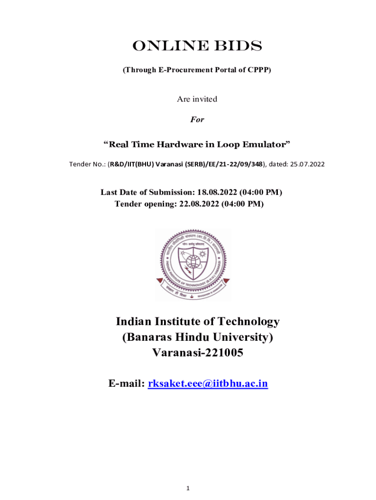 Online Bids (Through Procurement Portal of PPP)Are invited For Real Time Hardware in Loop Emulator Tender No.: (R&D/IIT(BHU) Varanasi (SERB)/EE/2122/09/348), dated: 25.07.2022Last Date of Submission: