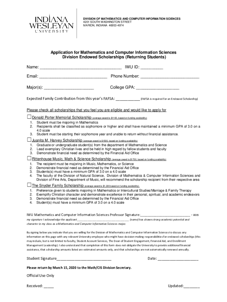 DIVISION OF MATHEMATICS AND COMPUTER INFORMATION SCIENCES 4201 SOUTH WASHINGTON STREET MARION, INDIANA 469534974Application for Mathematics and Computer Information Sciences Division Endowed Scholarships