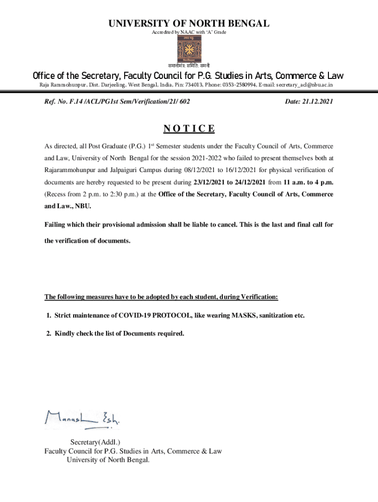 UNIVERSITY OF NORTH BENGAL Accredited by NAACP with A Grade : : Office of the Secretary, Faculty Council for P.G. Studies in Arts, Commerce & Law Raja Rammohunpur, Dist. Darjeeling, West Bengal, India,