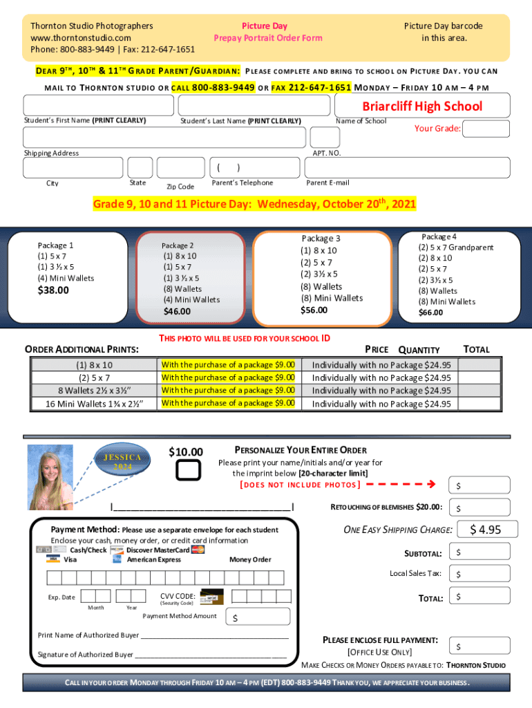 Thornton Studio Photographers www.thorntonstudio.com Phone: 8008839449 | Fax: 2126471651Picture Day Prepay Portrait Order Form DEAR 9 T H, 10 T H & 11 T H G MADE P AREN'T /G U A RADIAN : P L E AS