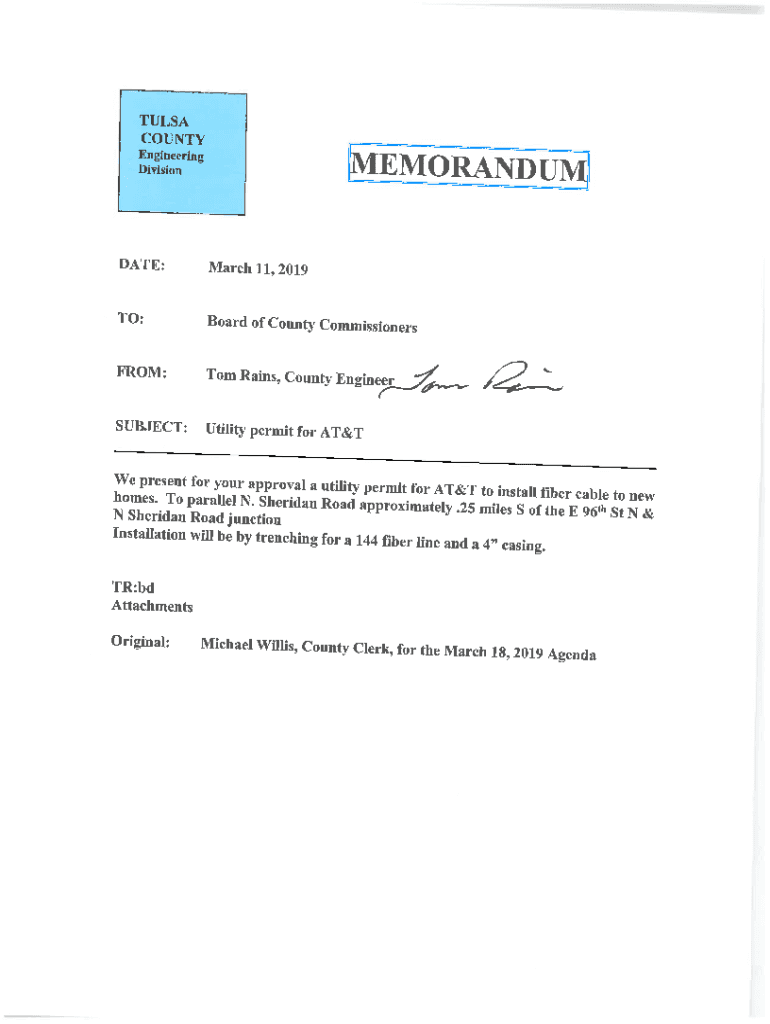 EngineeringMEMORANDUMDivisionDATE:March 11, 2019TO:Board of County CommissionersFROM:Terrains, CountyEngineerSUBJECT: Utility permit for AT&T:S5SS::^\”\'^InstaUationwillbebytrenchingfora