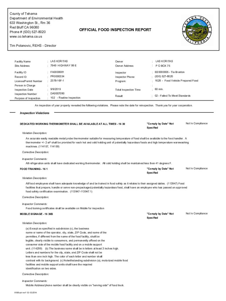 www.co.tehama.ca.usOFFICIAL FOOD INSPECTION REPORT Tim Botanic, REDS Director: