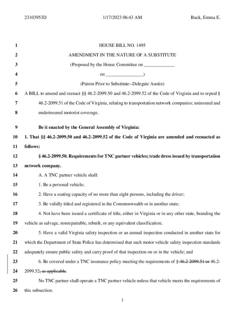 23103953D1/17/2023 06:43 AM Buck, Emma E.1HOUSE BILL NO. 14952AMENDMENT IN THE NATURE OF A SUBSTITUTE3(Proposed by the House Committee on ___4on ___)5(Patron Prior to SubstituteDelegate Austin)6A