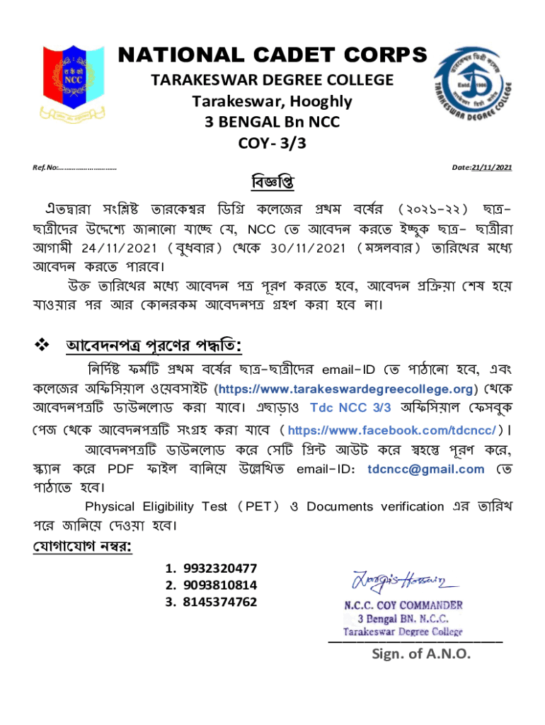 NATIONAL CADET CORPS TARAKESWAR DEGREE COLLEGE Tarakeswar, Highly 3 BENGAL In NCC COY 3/3 Ref.No:Date:21/11/2021 (), NCC