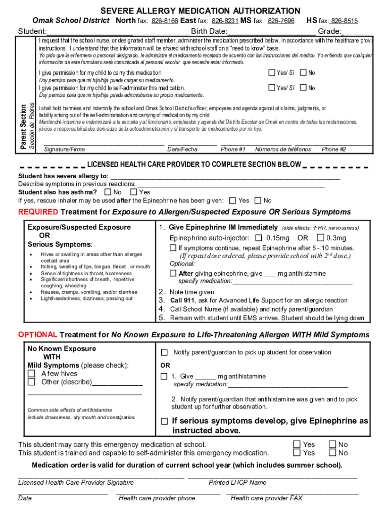 SEVERE ALLERGY MEDICATION AUTHORIZATIONOmak School District North fax: 8268166 East fax: 8268231 MS fax: 8267696 Student: ___ Birth Date:HS fax: 8268515 Grade: ___I request that the school nurse,