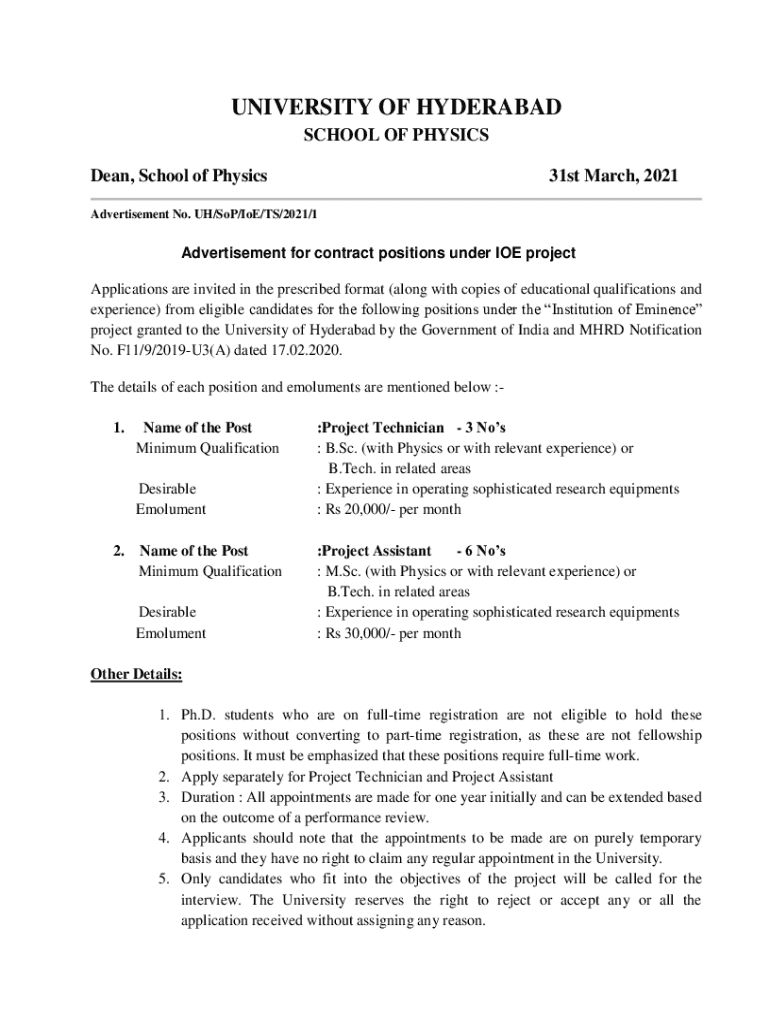 UNIVERSITY OF HYDERABAD SCHOOL OF PHYSICS Dean, School of Physics31st March, 2021Advertisement No. UH/SOP/Ice/TS/2021/1Advertisement for contract positions under ICE project Applications are invited