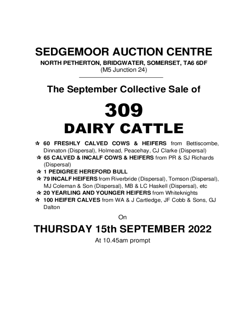 NORTH PETERSON, BRIDGEWATER, SOMERSET, TA6 6DF(M5 Junction 24)The September Collective Sale of309DAIRY CATTLE