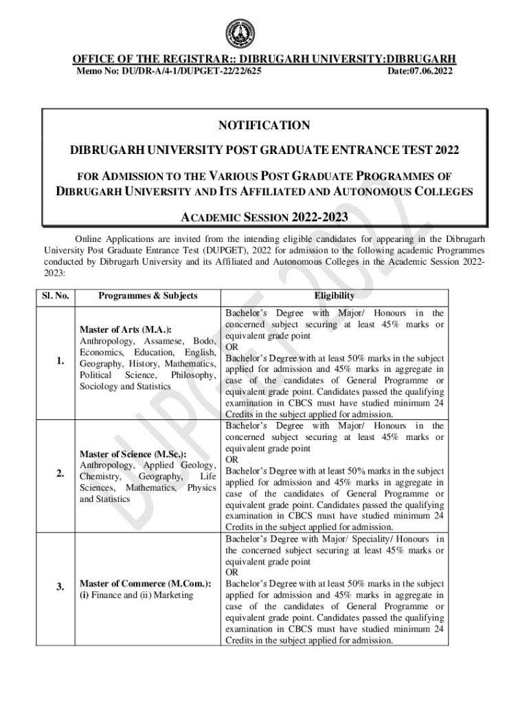 OFFICE OF THE REGISTRAR:: DISREGARD UNIVERSITY:DISREGARD Memo No: DU/DRA/41/DUPGET22/22/625Date:07.06.2022NOTIFICATION DISREGARD UNIVERSITY POST GRADUATE ENTRANCE TEST 2022 FOR ADMISSION TO THE VARIOUS