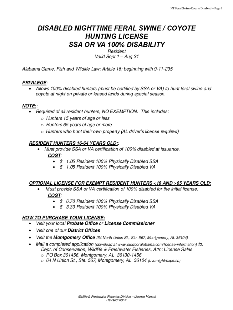 NT Feral SwineCoyote Disabled Page 1DISABLED NIGHTTIME FERAL SWINE / COYOTE HUNTING LICENSE SSA OR VA 100% DISABILITY Resident Valid Sept 1 Aug 31 Alabama Game, Fish and Wildlife Law; Article 16;