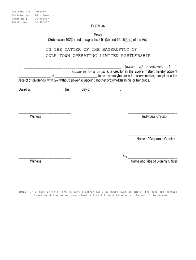 District of: Division No.: Court No.: Estate No.:Ontario 09 Toronto 31458487 31458487FORM 36Proxy (Subsection 102(2) and paragraphs 51(1)(e) and 66.15(3)(b) of the Act)IN THE MATTER OF THE BANKRUPTCY