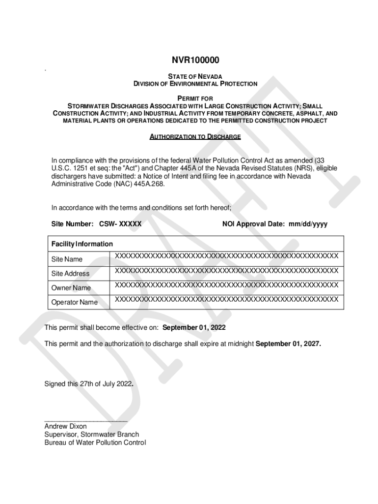 NVR100000. STATE OF NEVADA DIVISION OF ENVIRONMENTAL PROTECTION PERMIT FOR STORMWATER DISCHARGES ASSOCIATED WITH LARGE CONSTRUCTION ACTIVITY; SMALL CONSTRUCTION ACTIVITY; AND INDUSTRIAL ACTIVITY FROM