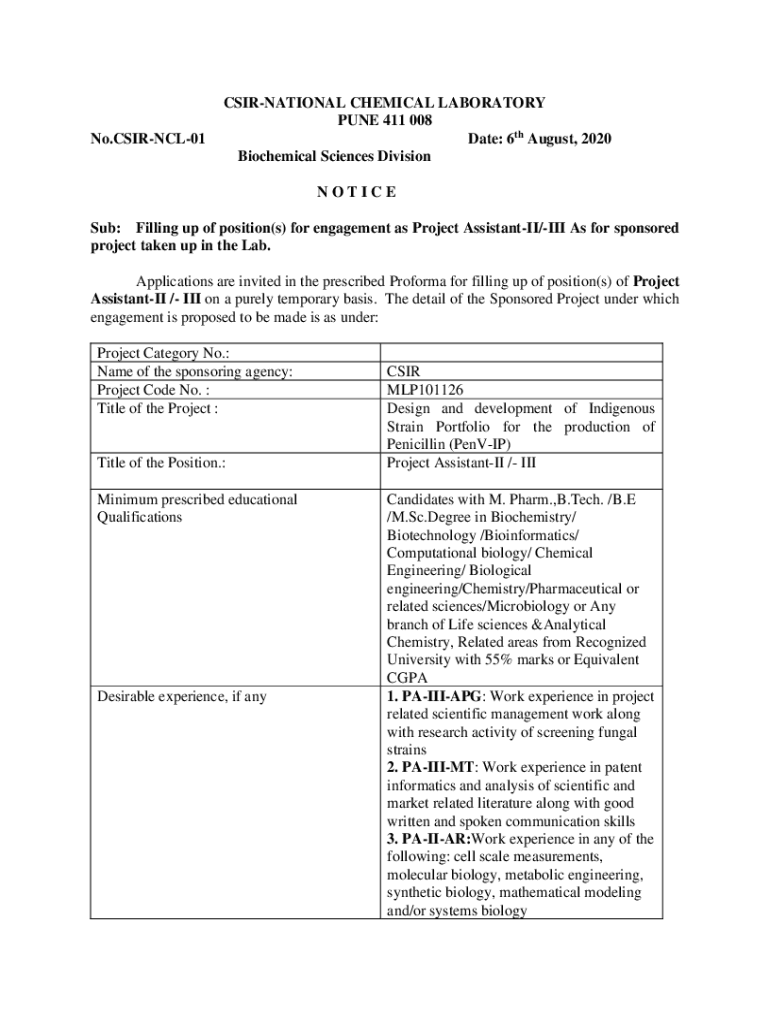 No.CSIRNCL01CSIRNATIONAL CHEMICAL LABORATORY PUNE 411 008 Date: 6th August 2020 Biochemical Sciences Division Notices: Filling up of position(s) for engagement as Project Assistant/III As for sponsored
