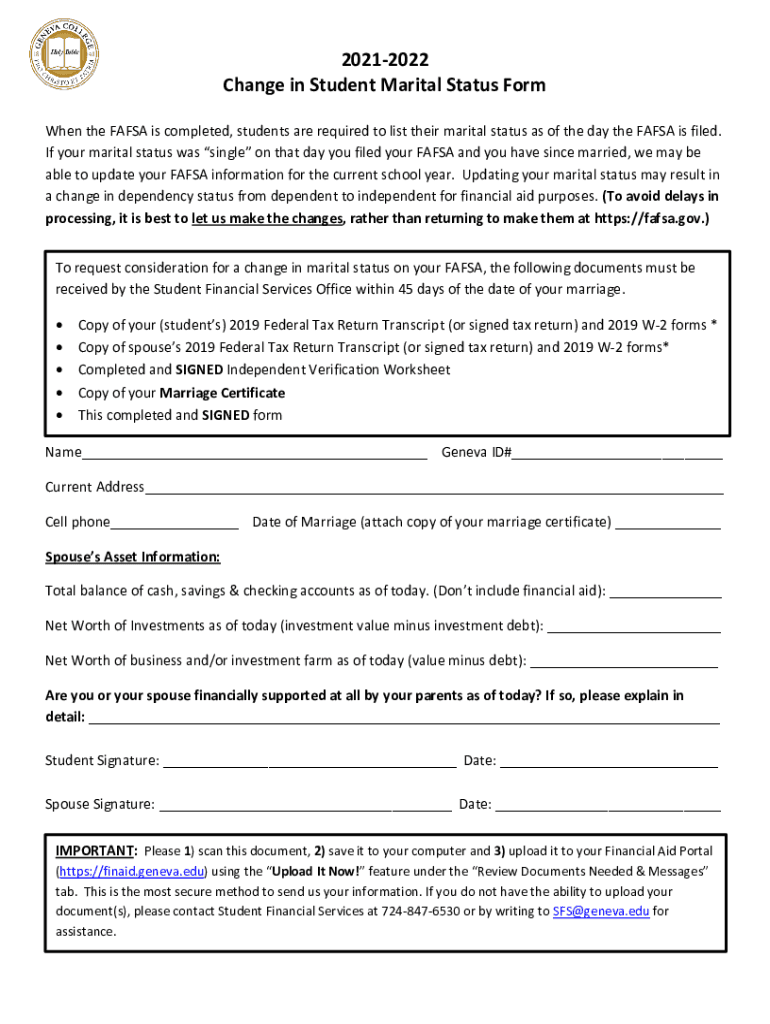 20212022 Change in Student Marital Status Form When the FAFSA is completed, students are required to list their marital status as of the day the FAFSA is filed. If your marital status was single on