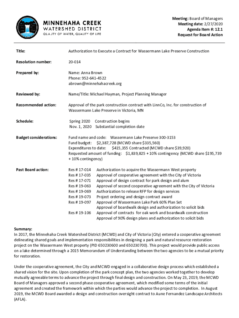 Title:Authorization to Execute a Contract for Wassermann Lake Preserve ConstructionResolution number:20014Prepared