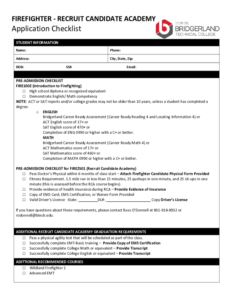 FIREFIGHTER RECRUIT CANDIDATE ACADEMYApplication Checklist STUDENT INFORMATION Name:Phone:Address:City, State, Zip:DOB:SS#Email:READMISSION CHECKLIST FIRE1002 (Introduction to Firefighting) High school