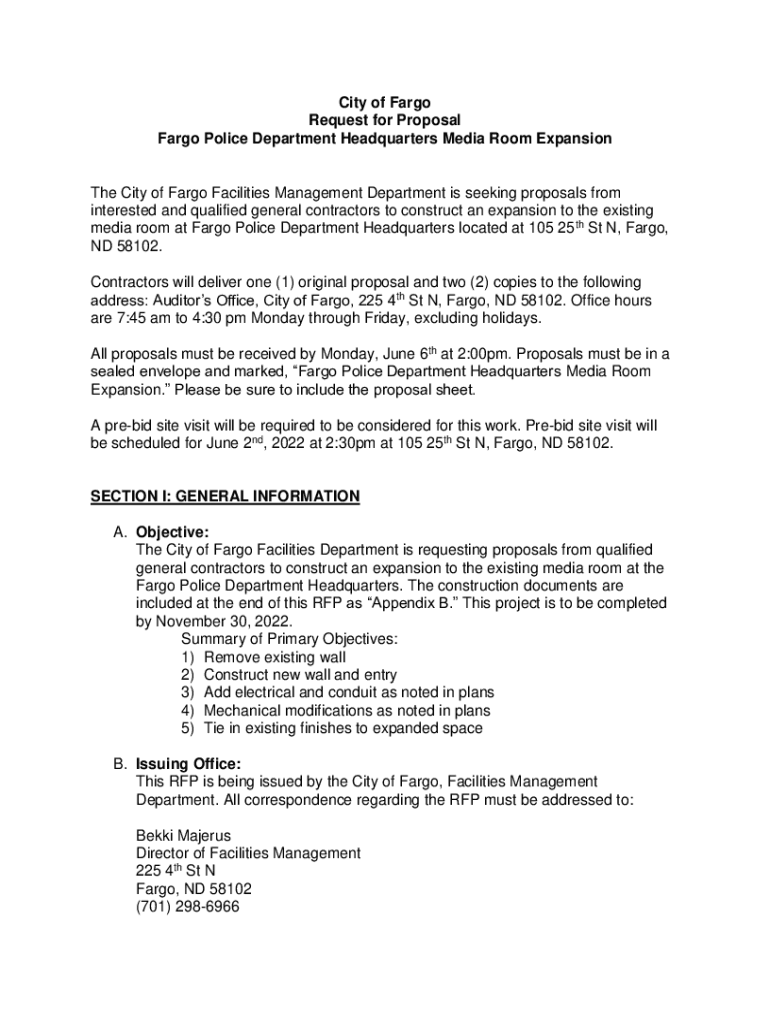 City of Fargo Request for Proposal Fargo Police Department Headquarters Media Room Expansion City of Fargo Facilities Management Department is seeking proposals from interested and qualified general