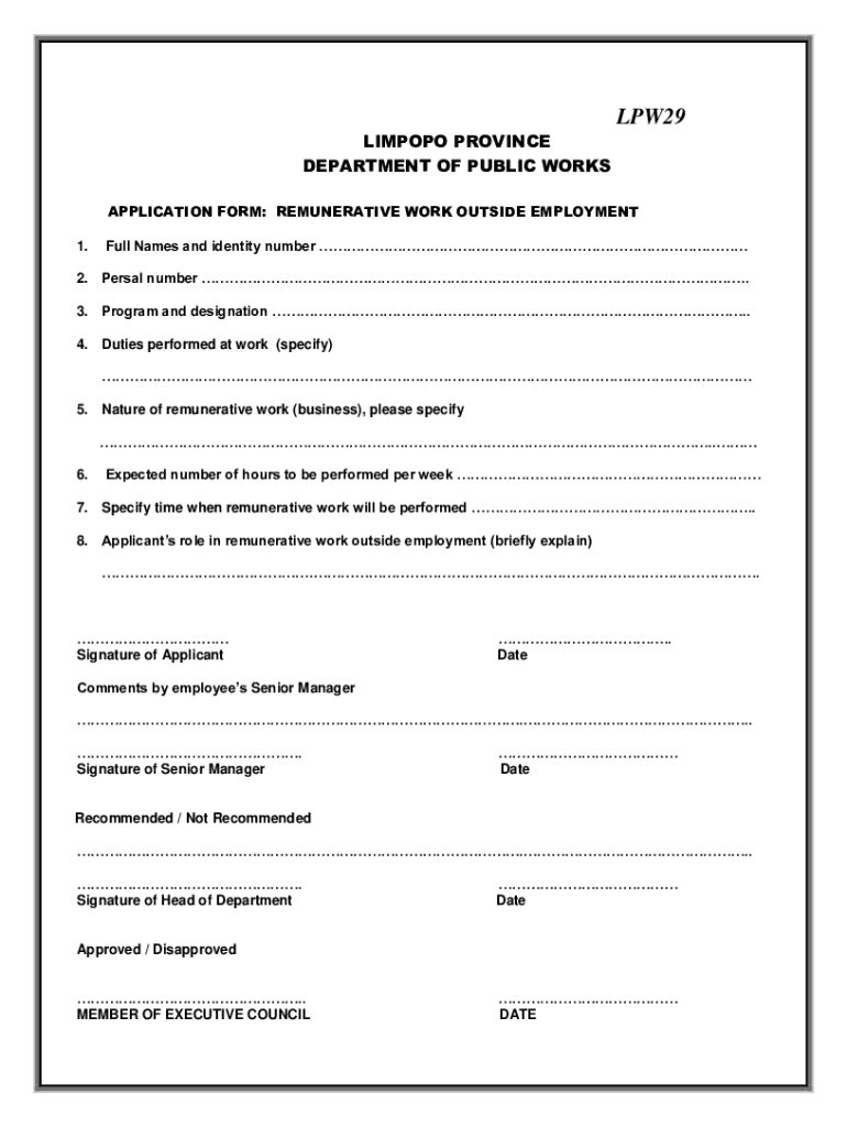 LPW29 LIMPOPO PROVINCE DEPARTMENT OF PUBLIC WORKS APPLICATION FORM: REMUNERATIVE WORK OUTSIDE EMPLOYMENT 1. Full Names and identity number 2. Perusal number. 3. Program and designation.
