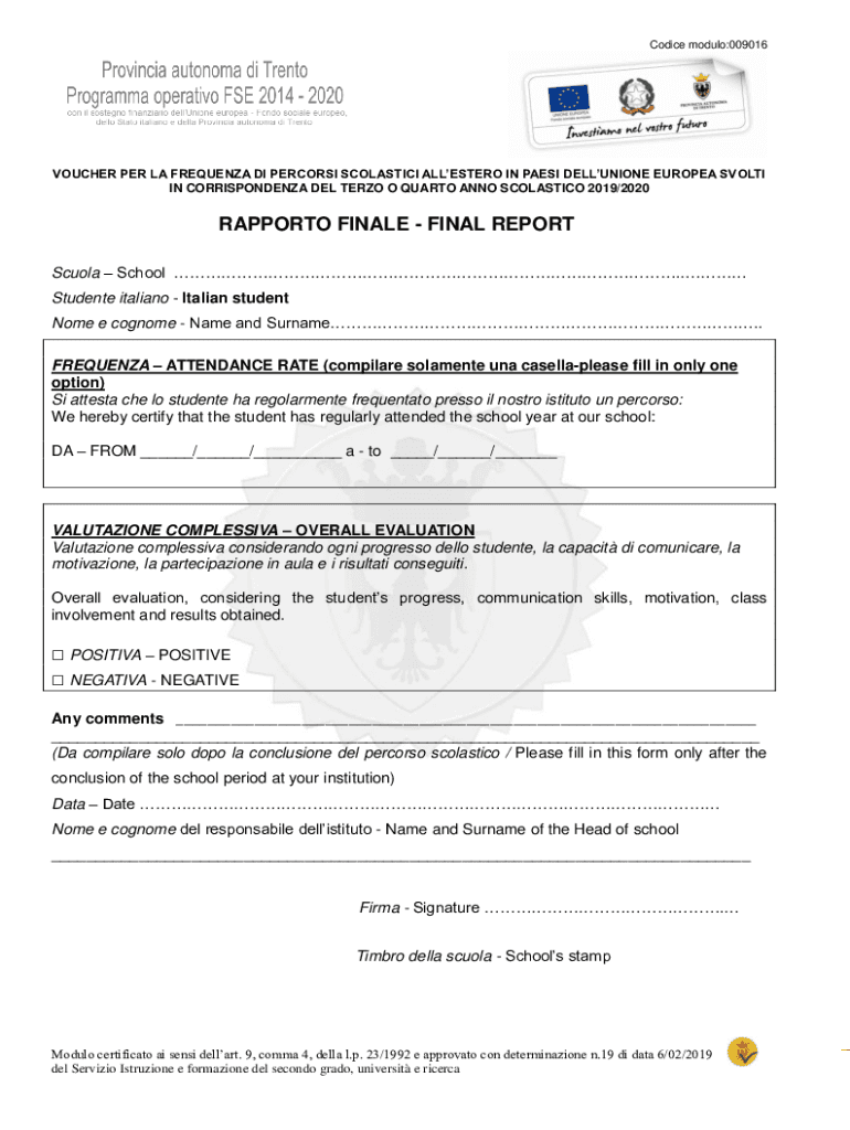 Codices modulo:009016VOUCHER PER LA FREQUENCY DI PERCO RSI SCHOLASTIC ALLISTER IN PAES DELUSION EUROPEAN VOLT