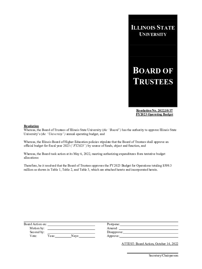 ILLINOIS STATE UNIVERSITYBOARD OF TRUSTEES Resolution No. 2022.10/37 FY2023 Operating Budget Resolution Whereas, the Board of Trustees of Illinois State University (the Board) has the authority to