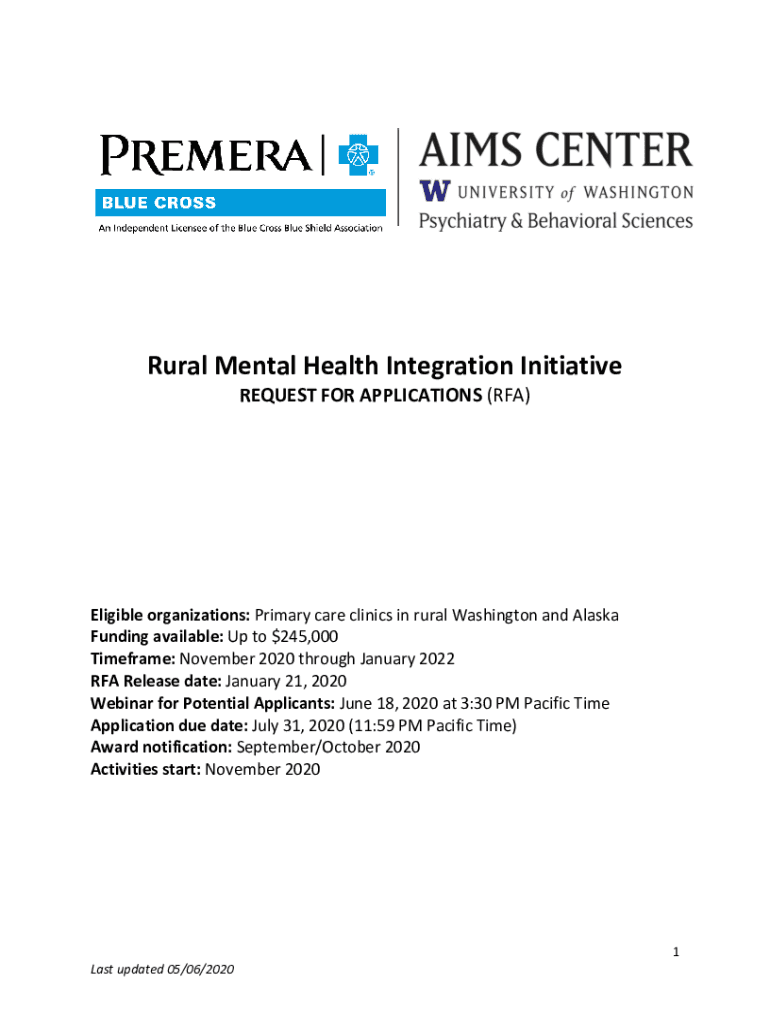 Rural Mental Health Integration Initiative REQUEST FOR APPLICATIONS (RFA)Eligible organizations: Primary care clinics in rural Washington and Alaska Funding available: Up to $245,000 Timeframe: November