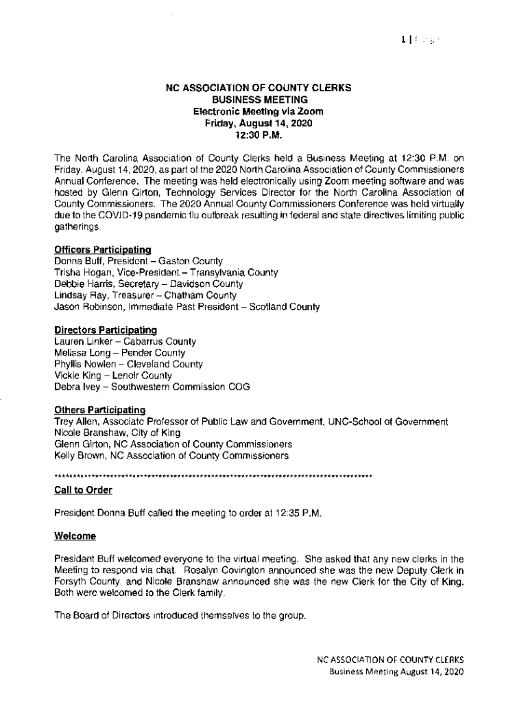 1 (cig1NC ASSOCIATION OF COUNTY CLERKS BUSINESS MEETING Electronic Meeting via Zoom Friday, August 14, 2020 12:30 P.M. The North Carolina Association of County Clerks held a Business Meeting at 12:30