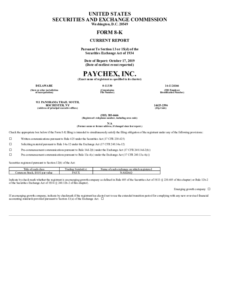 UNITED STATES SECURITIES AND EXCHANGE COMMISSION Washington, D.C. 20549FORM 8K CURRENT REPORT Pursuant To Section 13 or 15(d) of the Securities Exchange Act of 1934 Date of Report: October 17, 2019